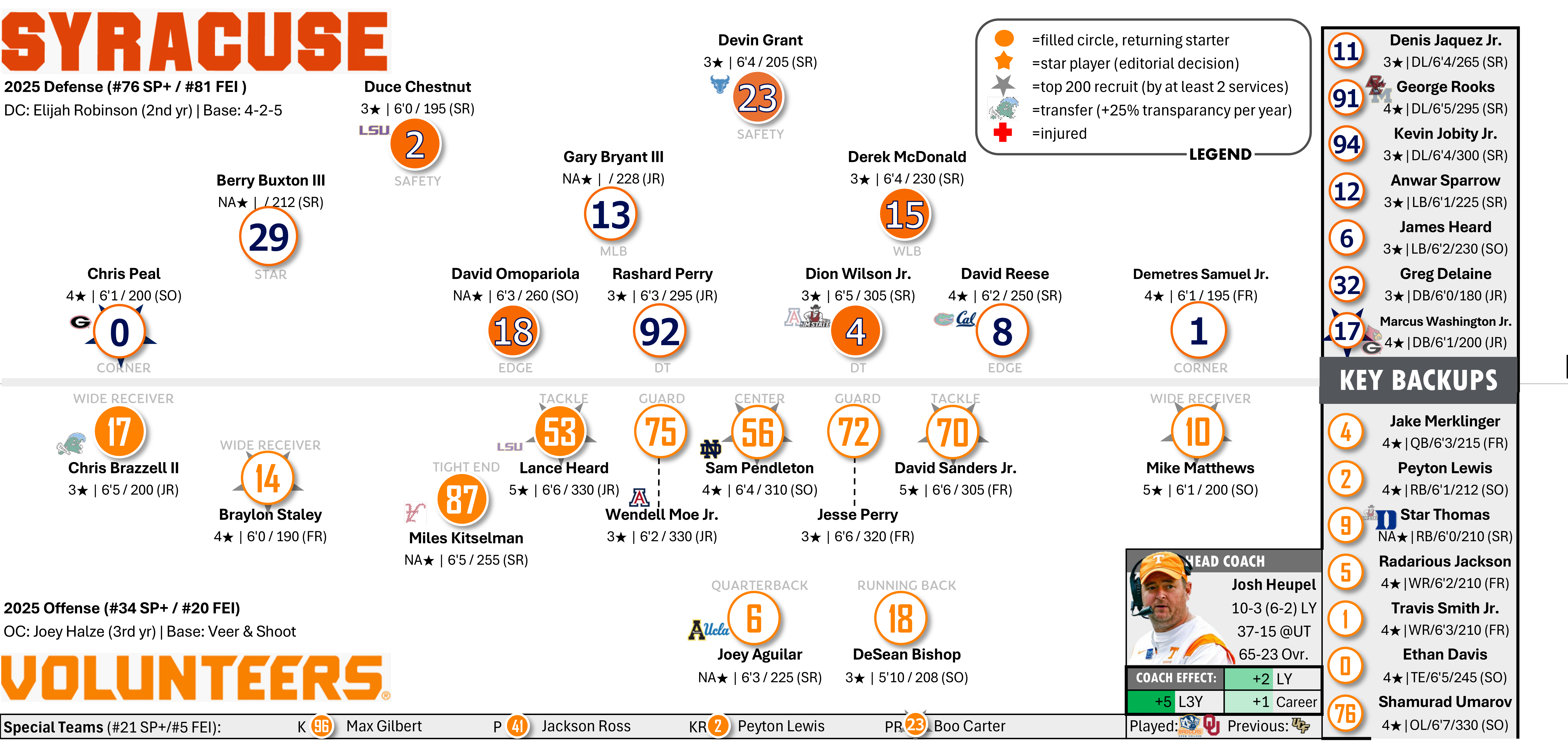 On the Tennessee side, the lone returning OL, Lance Heard, will have a lot of eyes on him this season—can Heard live up to the five-star hype that followed him here from LSU?