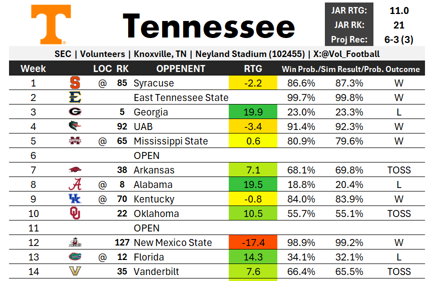 Let me get this out of the way: this summer, I rolled out our in-house power rating, the JAR Rating System. Version 0.0.1 had a sunny outlook on the Vols’ season, but I always knew I’d need to update some data as it became available near the start of the season. The latest JAR update isn’t as bullish on Tennessee as the season opens: