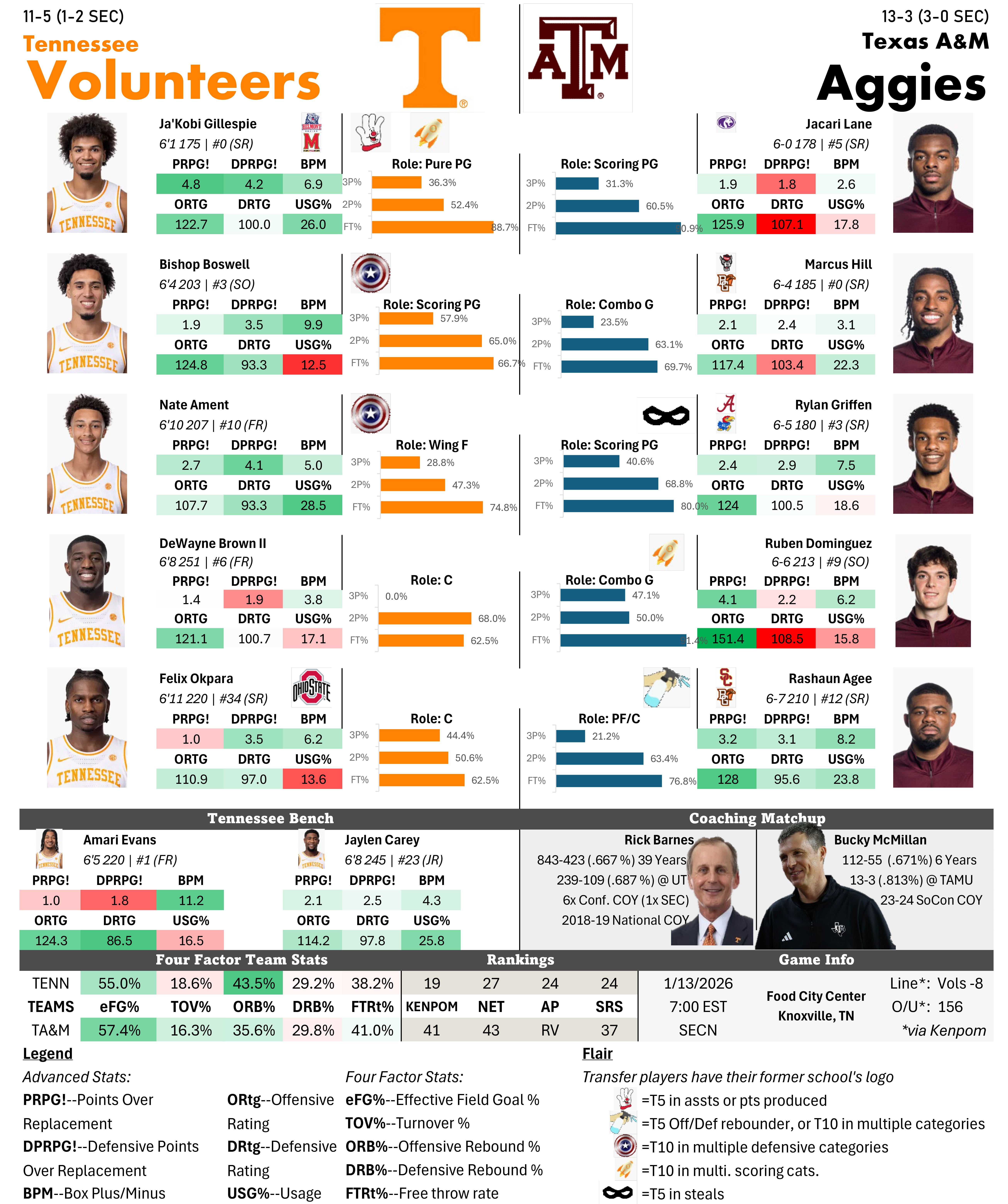 Tennessee Vols vs. Texas A&M Aggies Basketball Preview GraphicOne month to baseball season FWIWAndy KatzerJan 13, 2026ShareTennessee vs. Texas A&M | 7:00 EST Tuesday, Jan. 13 | SEC Networkidk turnovers probably lolSubscribe