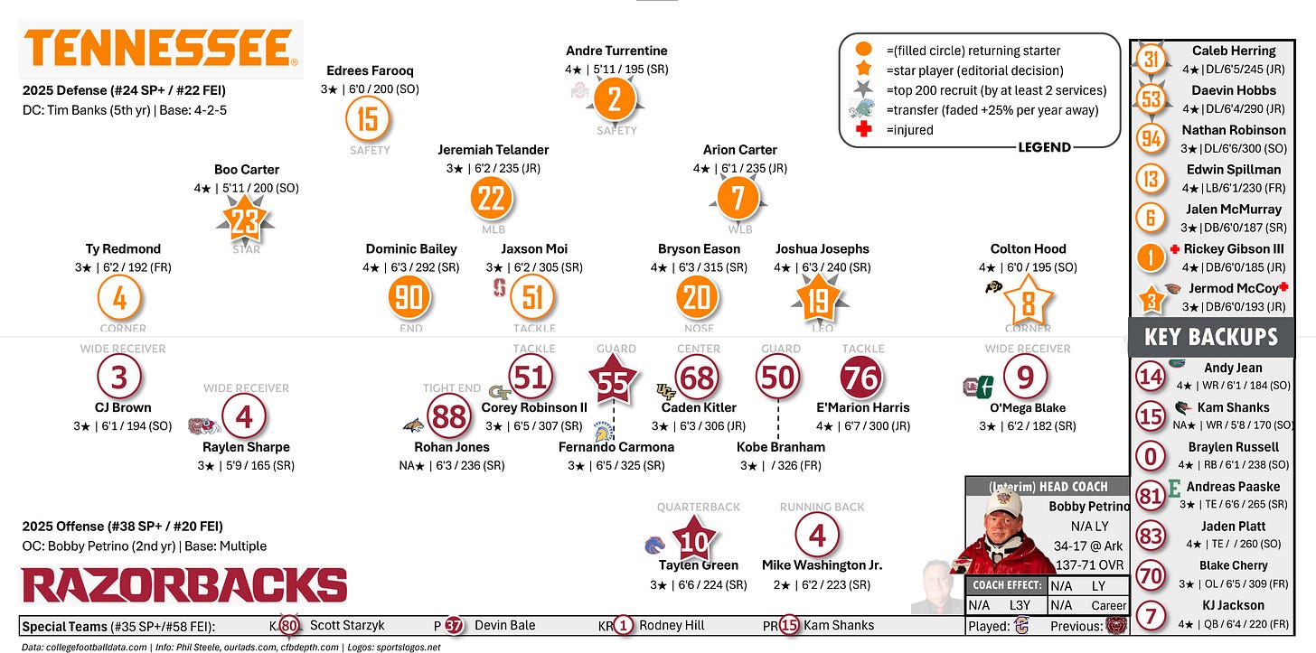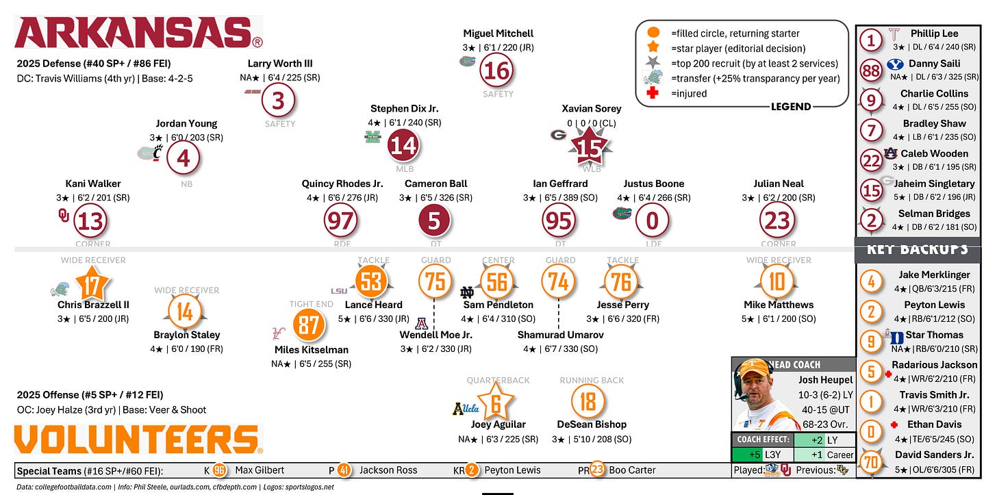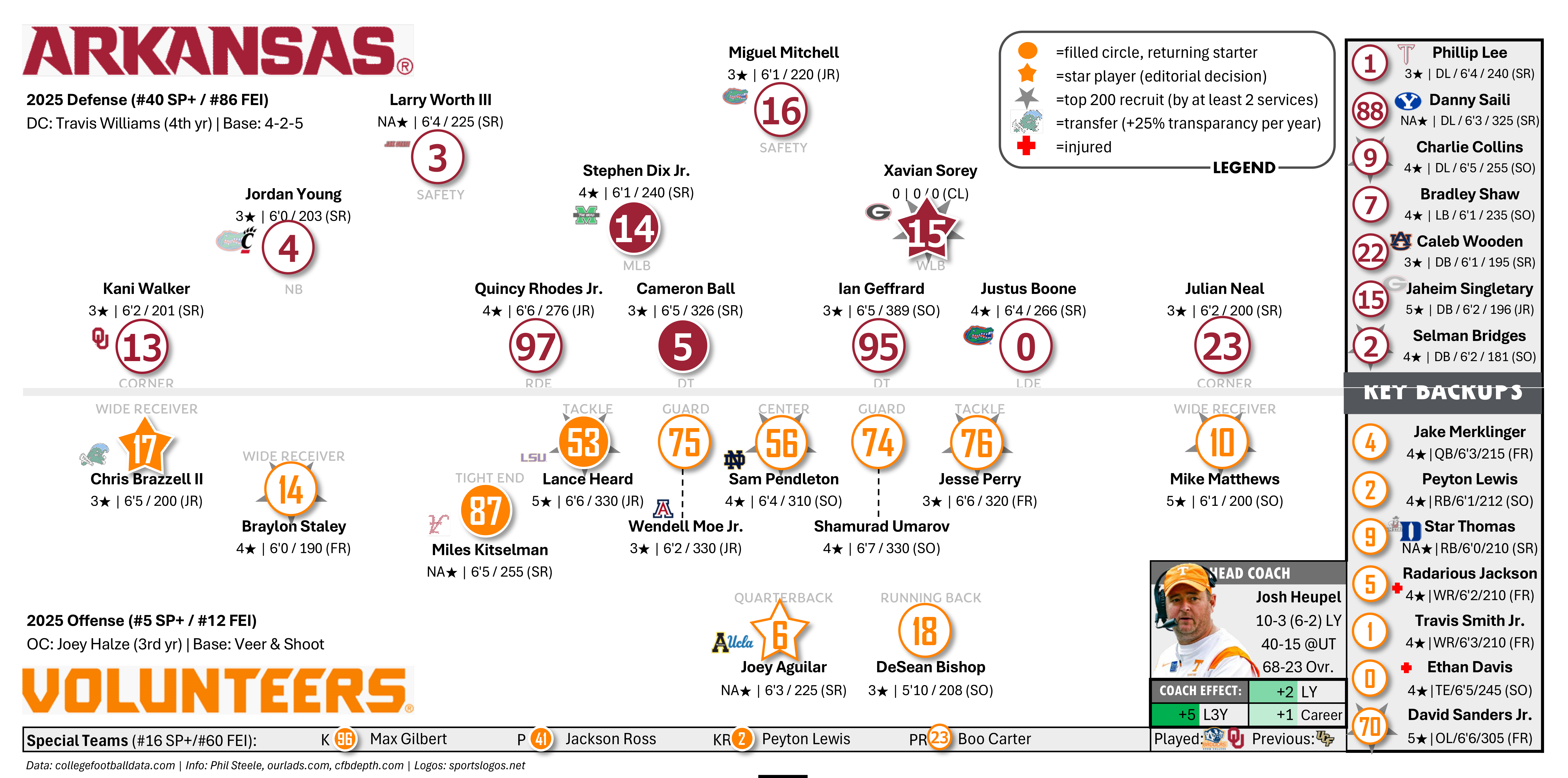 For Tennessee, I’ve upgraded Joey Aguliar’s and Chris Brazzell’s circles to stars on the chart. Brazzell was a no-brainer the way he’s played this season and especially in two SEC games. Joey Swags probably doesn’t get the notoriety he deserves nationally for how he’s played, but we see it here.
