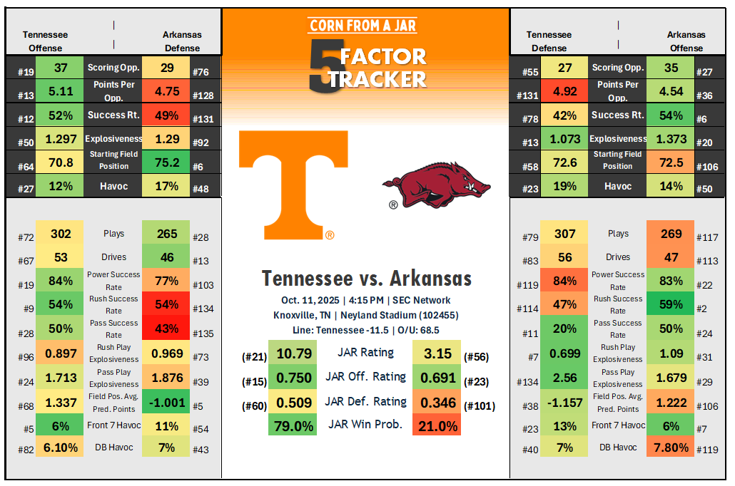 I’ll put a prediction down below, but here’s a spoiler. The JAR Rating (which I will freely admit has flaws) still shows what I believe will be the deciding factor in this game. Both teams have top 25 offenses. Tennessee’s has been a little better to date but you could take either group and score points. But there’s a stark difference in these teams’ defenses. It’s true that UT’s defense has not been the standout group we saw a year ago. But Arkansas’ defense has been downright putrid this season. The Razorbacks gave up fewer than 30 points in their first two games (against Alabama A&M and Arkansas State). Since then, the floodgates have been open, and there’s little reason to think Saturday will be much different.
